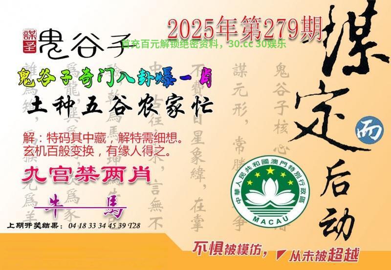 ╠解鬼谷子╣279期:“土种五谷农家忙”这句话描述了农家在土地上种植五谷杂粮,忙碌于田间地头的情景。在十二生肖中,牛以其勤劳、坚韧、任劳任怨的形象著称,是农耕文明的重要象征。牛不仅力气大,能耕田种地,还性情温顺,易于驯服,是农家不可或缺的得力助手。因此,将土种五谷农家忙与生肖牛相联系,既符合成语的意境,又凸显了牛的农耕价值 |